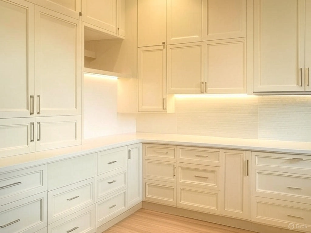 Ivory Modern – L-Shape with Tall Pantry and Lighting