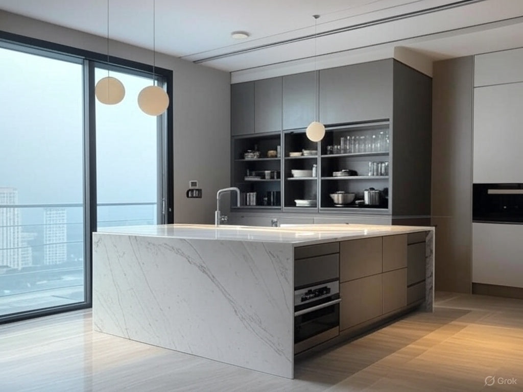 This premium layout features a central island with a cascading marble countertop, perfect for open kitchens and social spaces. 👉 Book a Free Design Consultation